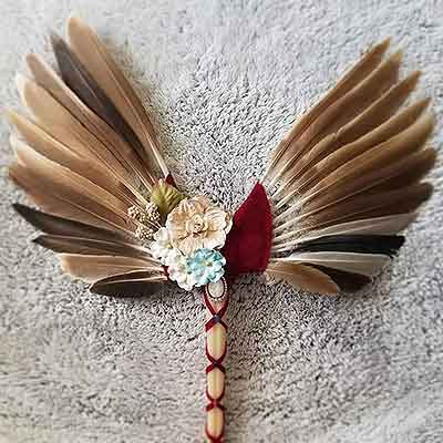 My journey started six years ago when I created my first fan for personal use. Almost as soon as people saw that first piece, requests started coming in for me to create more. That one fan has branched out to become a wide range of items including wands, dreamcatchers, clay sculptures and feather pens.