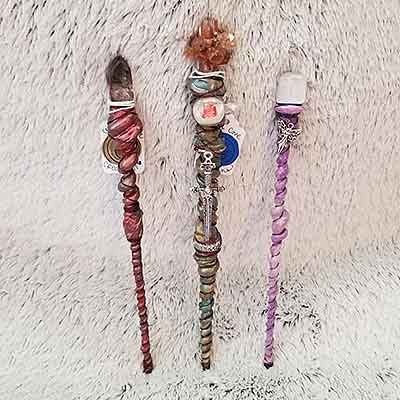 The handle is wrapped in deer hide and decorated with a variety of gemstones, ropes and crystals.
