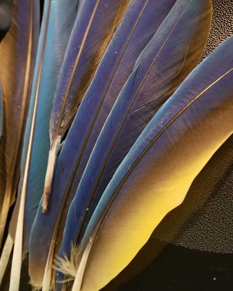 I rarely start with a specific design in mind, but rather build my creations around the feathers and materials themselves. Feathers are naturally molted and a lot of material is sourced from our 30 acre family farm in Washington state.